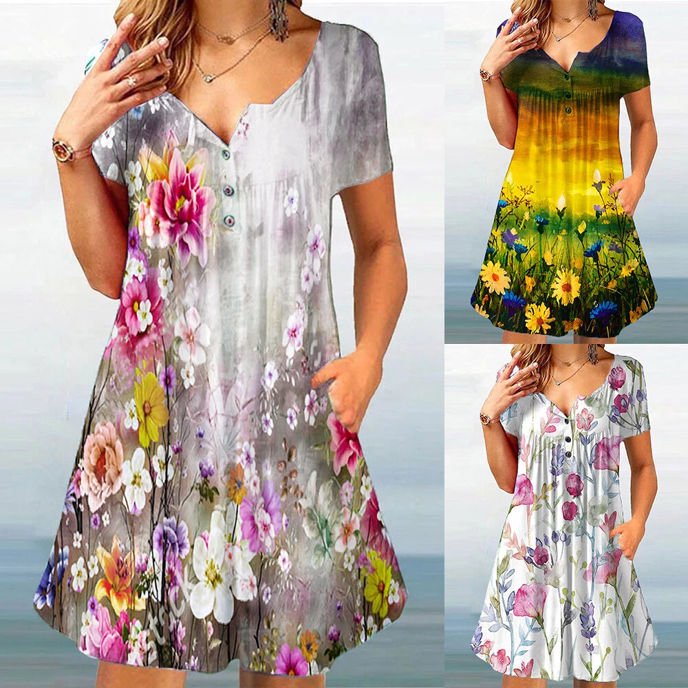 Frauen Boho Floral Kurzarm Hemd Kleid Casual Lose Tunika